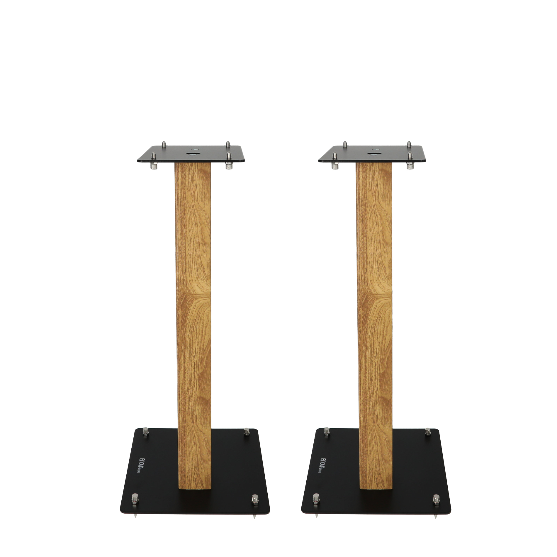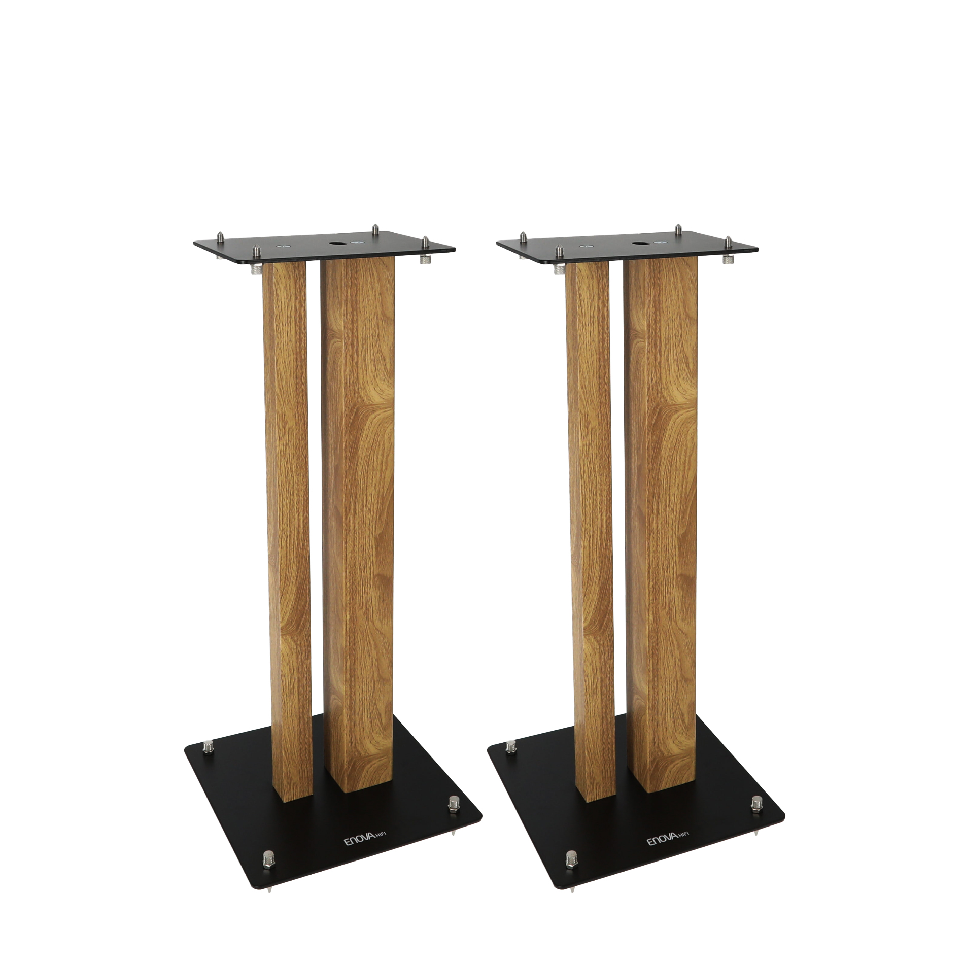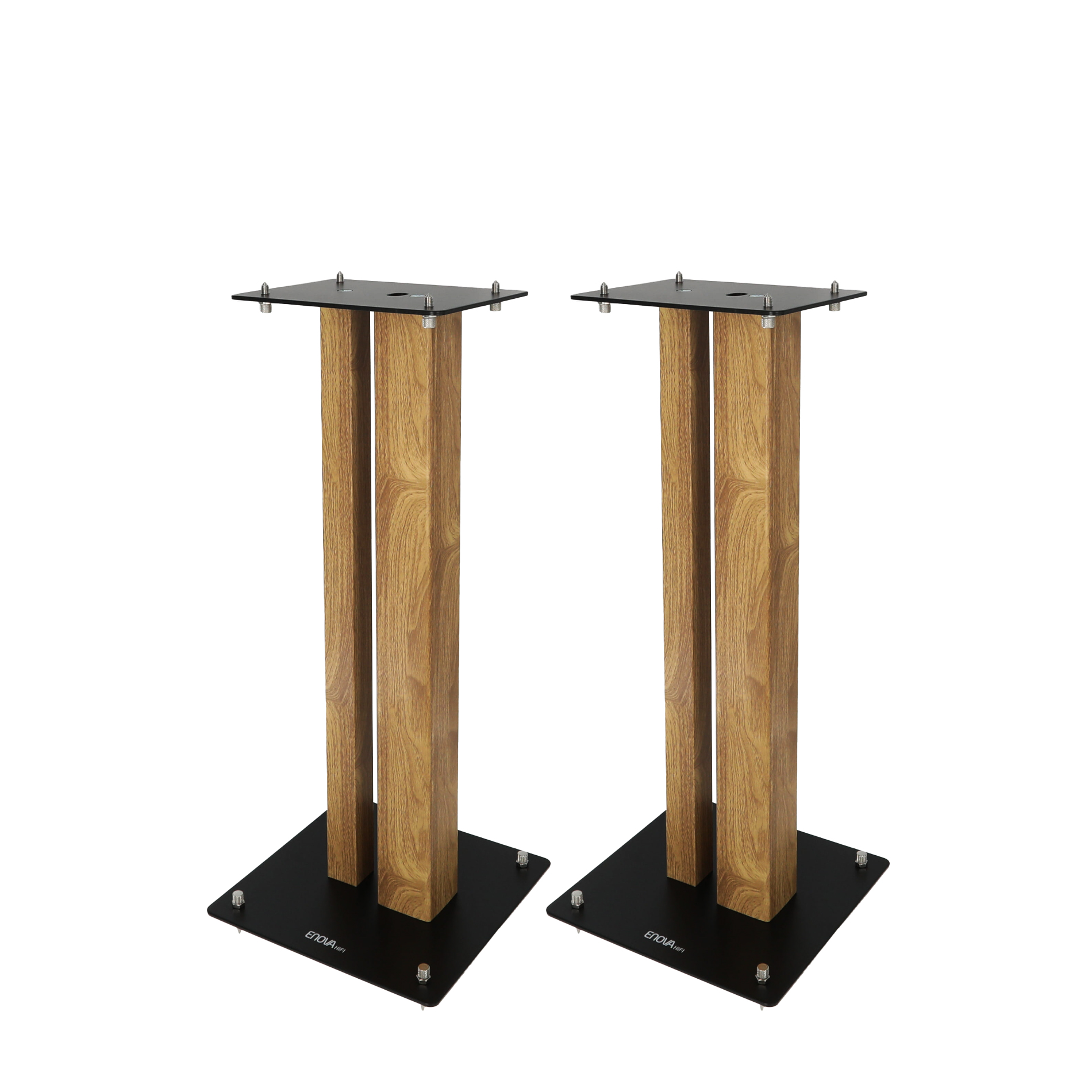 - Hauteur : 60 cm- Dimension de la base inférieure : 26 x 26 cm- Dimension de la base supérieure  : 17 x 22,5 cm- Taille du grand tube : 60 x 60 mm- Taille du petit tube : 34 x 34 mm- Épaisseur de la base inférieure et supérieure : 4 mm- Charge maximale : 70 kg- Matériau : acier- Finition : noir/bois- Livré par paire- Poids de la paire : 22,30 kg