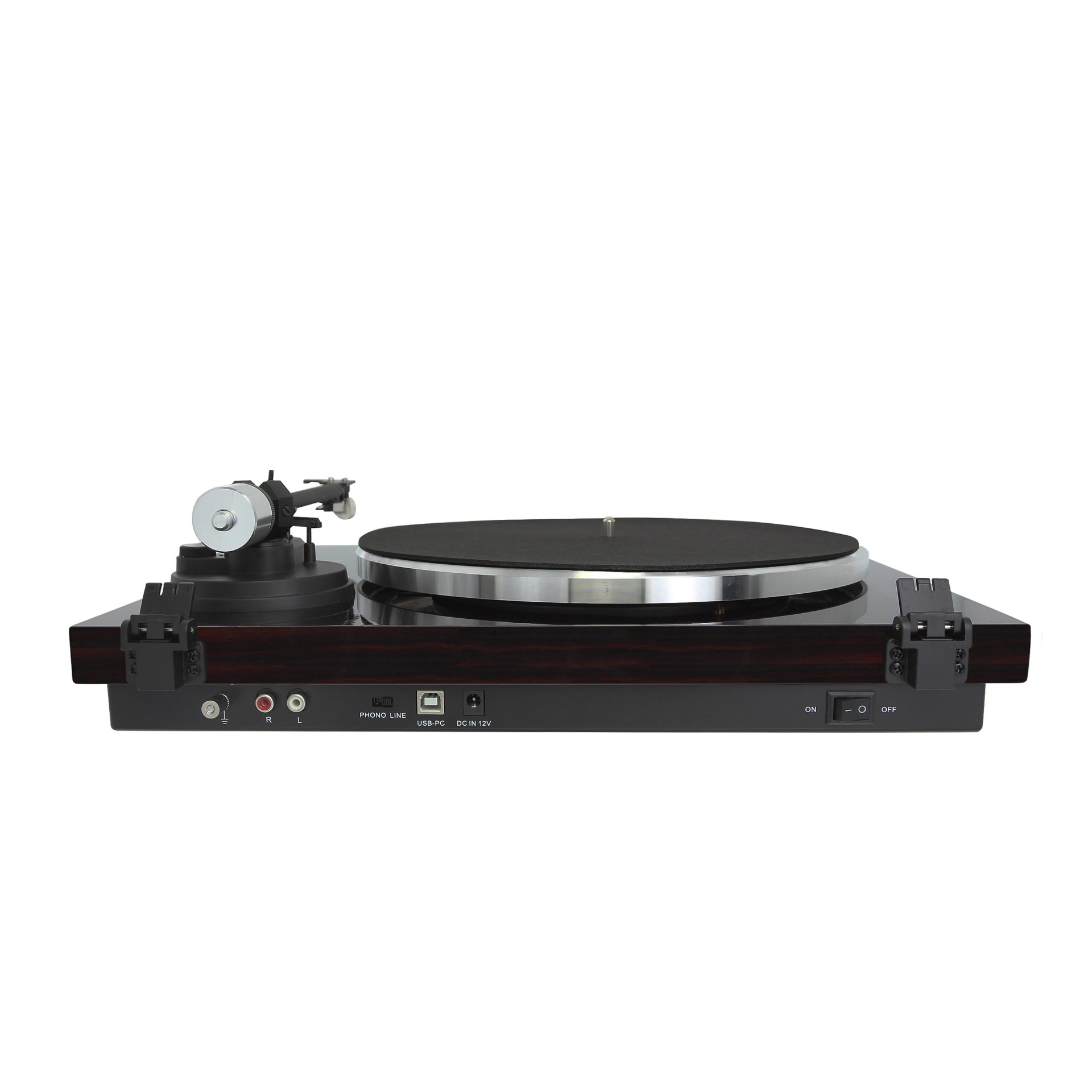 - Platine vinyle hifi à courroie- Finition : bois foncé brillant- Préampli RIAA intégré avec sélecteur Line/Phono- Prise de masse- Vitesse de rotation au choix : 33 ou 45T à l?aide d?un sélecteur sur le plateau- Sélecteur Marche / Arrêt sur le plateau- Equipée d?une cellule Audio Technica 3600L- Nouveau bras droit équipé d?un bouton de réglage de l?anti-skating- Longueur du bras : 222 mm- Force d?appui du diamant : 3 à 6 g- Connectique : USB - USB permettant de numériser vos vinyles- Utilisez Audacity pour ce faire par exemple- Alimentation externe : 12V/500mA, AC/DC- Bouton ON/OFF en face arrière- Consommation d?énergie : 5W- Système Anti-patinage- Pleurage et scintillement : < 0,15%- Rapport S/N : 72 dB- Capot anti poussière fournie- Accessoires inclus : courroie, alimentation externe, centreur 45T, câble USB- Dimensions : 420 x 360 x 125 mm- Poids : 4,8 Kg