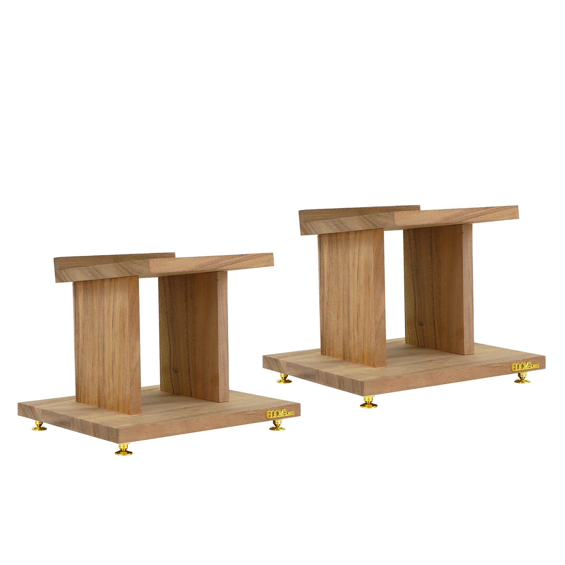 - Hauteur avant : 25 cm- Hauteur arrière : 23 cm- Dimension de la base inférieure : 34 x 28 cm- Dimension de la base supérieure : 23 x 23 cm- Épaisseur de la base inférieure et supérieure : 2 cm- Matériau : Bois (noyer)- Possibilité de les teinter à votre choix (Baume d?antiquaire) - Finition : bois- Pointes de découplage en laiton fournies- Livré par paire- Poids de la paire : 4,10 Kg