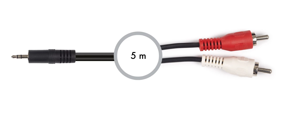 Cabo de áudio jack 3,5 mm a 2 RCA Liga dispositivos de áudio com conetor estéreo jack 3,5 mm a outros dispositivos de áudio com conetores RCA. Conetores e cobertura de PVC muito resistente, condutor de cobre com comprimento de 5 m, garantindo uma transmissão sem perdas do sinal de áudio. Para ligações de áudio de nível de linha entre dispositivos com conetor jack 3,5 mm estéreo e 2 RCA.