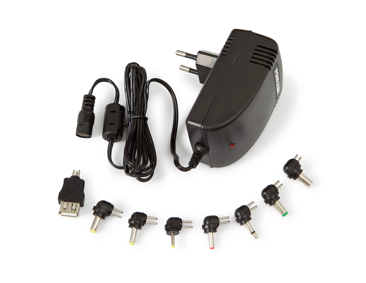 Adaptador CA/CC com voltagem selecionável (7 ajustes diferentes de voltagem) e 8 conetores intermutáveis, compatíveis com as ligações CC mais comuns. Comutado e estabilizado, com uma alta eficiência energética e proteção contra curto-circuito, sobrecarga, temperatura e sobretensão. Alimente os seus dispositivos da forma mais segura e eficiente. Para alimentar equipamentos de 5 a 24 V CC, 36 W máximo e com conetores compatíveis.