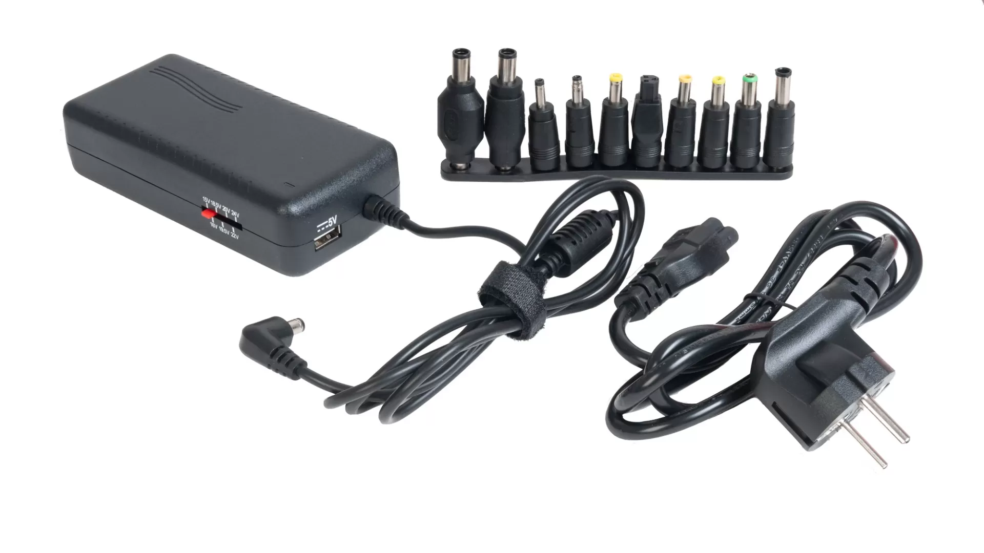 Adaptador CA/CC 15 a 24 V, 6 A, 90 W máximo e porta USB 5 V 2 A máximo, para computadores portáteis, netbooks, ecrãs LCD e TV, etc. Adaptador CA/CC com voltagem selecionável (7 ajustes de voltagem diferentes) e 10 conetores intermutáveis, compatíveis com computadores portáteis, netbooks, ecrãs LCD e TV, etc. Porta USB para alimentação e carga 5 V, 2 A máximo. Comutado e estabilizado, com alta eficiência energética. Alimente os seus dispositivos da forma mais segura e eficiente. Para alimentar computadores portáteis, netbooks, ecrãs LCD e TV de 15 a 24 V CC, 90 W máximo.