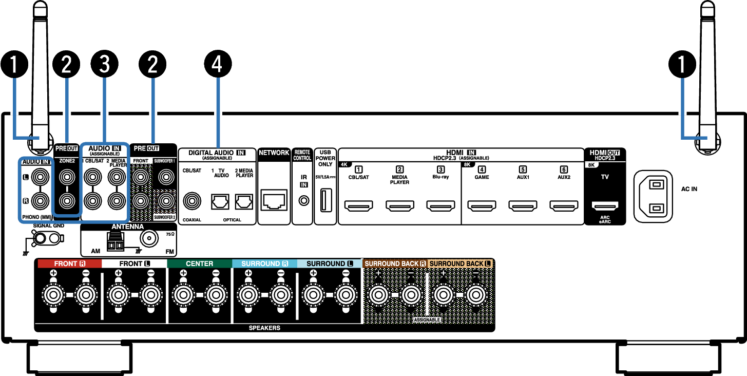 Suporte 8K: entradas HDMI compatíveis com 8K/60Hz e 4K/120Hz, pass-through HDCP 2.3.