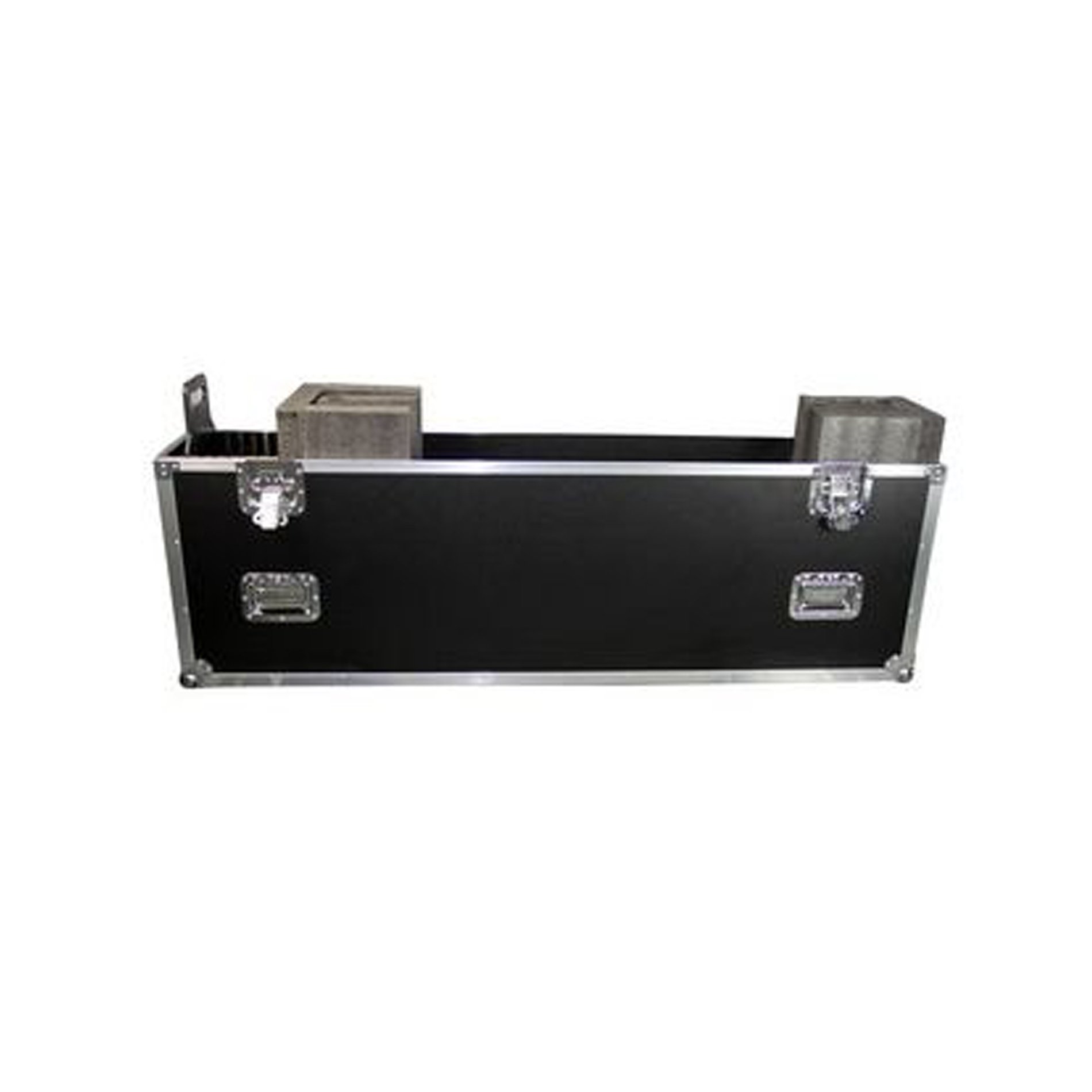 - Compartimento removível (separado por uma placa de madeira) - Cantos metálicos tipo bola para proteção e empilhamento - Cantos em perfil de alumínio / Reforços de canto - 12 alças de transporte metálicas embutidas - Cunhas compactas de espuma - 4 fechos tipo borboleta - Acabamento preto e prata - Bandeja com 4 rodízios integrados - Dimensões mais compactas para fácil manuseio - Dimensões máximas da tela: 1408 x 140 x 90 0mm - Dimensões (C x A x P) em mm 1549 x 960 x 250 - Peso: 51 kg