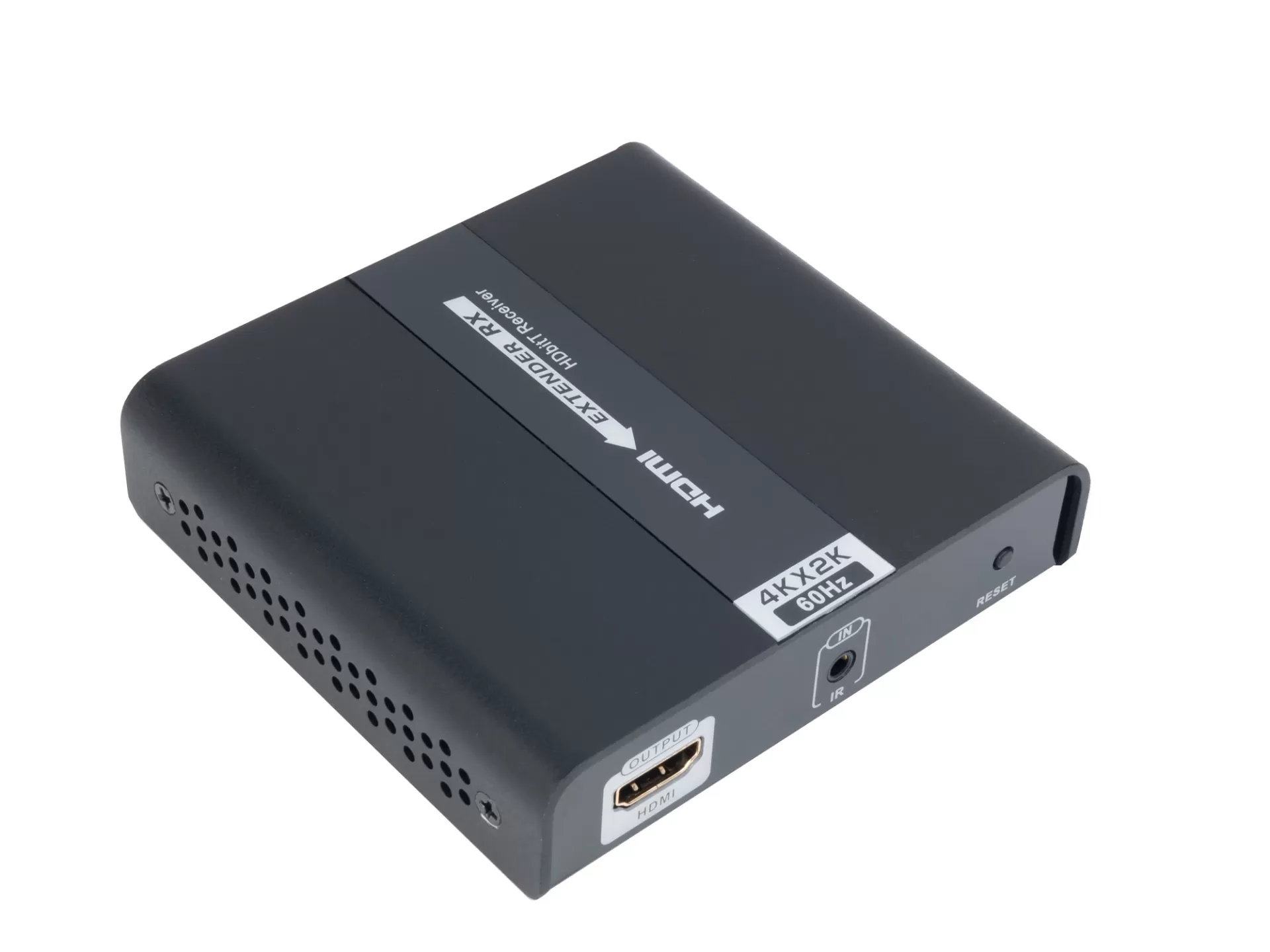 Recetor Extensão-Distribuidor HDMI 2.0 sobre IP Utiliza a tecnologia mais avançada para comprimir e transmitir sinal de vídeo e áudio sobre redes de dados com switch 1 Gigabit. Sinais de resolução UHD 4K@60 Hz. É fácil de configurar e distribuir o sinal HDMI a muitos recetores. Transmite o sinal sobre um só cabo de Cat 6 até 120 m. Características: - Encaminha uma fonte HDMI a múltiplas TV HDMI através de uma rede LAN com switch 1 Gigabit. - Amplia o sinal HDMI sobre um só cabo Cat 5/5e/6. - Distância de transmissão de até 120 m para sinal UHD 4k@60Hz. - Ligação ponto-ponto e ponto-multiponto. - Sinal de comando à distância IR para controlar as fontes a partir da localização de recetores. - Em conformidade com HDMI 2.0 e HDCP 2.2 Para instalações onde a fonte de vídeo fica longe das TV ou projetores e seja necessário levar o mesmo sinal HDMI a várias TV ou projetores, como em: exposições, montras, salas de formação, salas de conferências, centros desportivos, bares, restaurantes, etc.