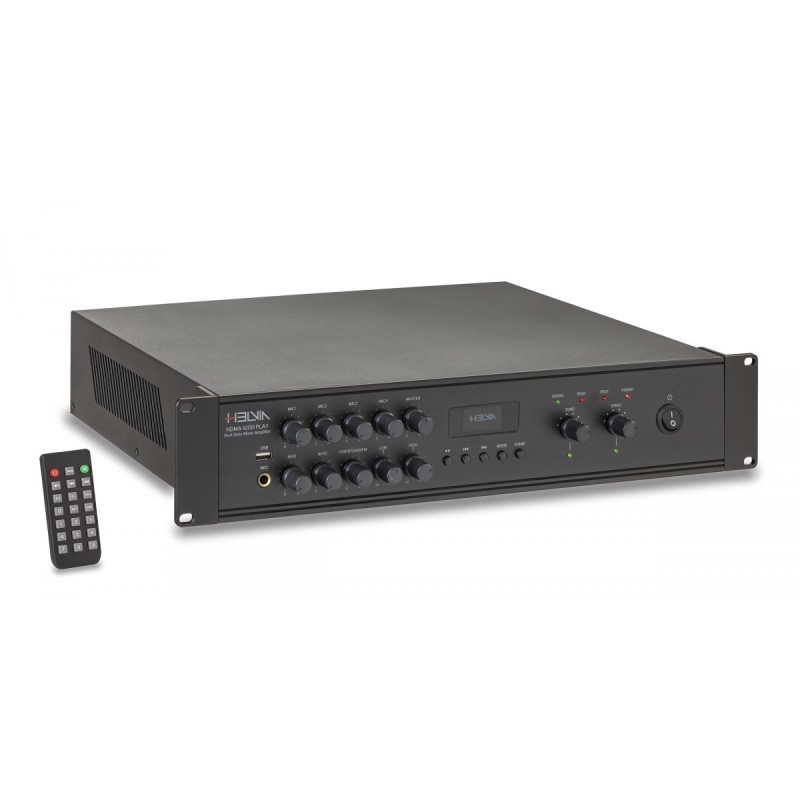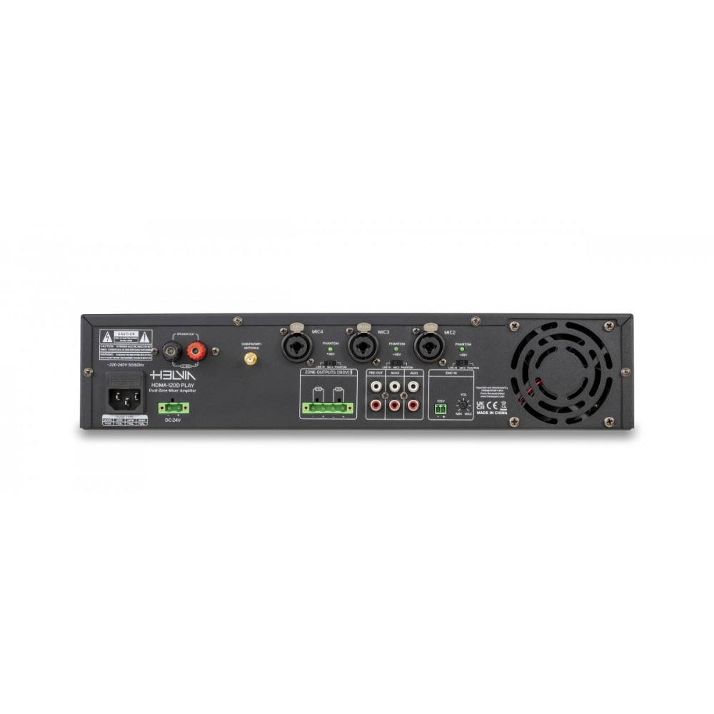 Home Amplificadores Profissionais HDMA-240D PLAY - HELVIA HDMA-240D PLAY - HELVIA 425,00 € Desconto de %. IVA incluído. Comprar Contactar Adicionar à wishlist Rated power: 240W. Frequency response: 100Hz-16Hz. Power outputs: 100V for each zone; Overall @ 4-160. THD: =%1. S/N Ratio: =80dB. N. Channels: 4 Mic Inputs, 2x Aux Line Inputs, 1x FM/DAB+/BT/USB Built-In Player. Eq Controls: Low (± 6dB @ 150Hz) High (± 6dB @ 10kHz). AUX Output: 1000mV. AUX 1-2 Input: 300mV. Mic 1 Input: 15mV ±3mV. MIC/Line 2/3/4 Inputs: 30mV ±3mV (Mic Position); 300mV (Line Position). EMC Input 100V. BT: BT; 5.0 Version with EDR (10m receiving range, without obstacles). DAB+: 170MHz-240MHz. FM Tuner: 88MHz-108MHz. USB Audio Format: MP3, WAV, WMA, SBC (FAT32, max. 128GByte). Main Power: AC220-240V, 50Hz/60Hz. Off-Load Consumption: 8W. Full-Load Consumption: 285W. Auxiliary Power: DC 24V - 10A max. Fuse: F2AL. Unit Size (W x D x H): 482 x 300 x 88 mm (16.8 x 3.5 x 11.8 in). Net Weight: 7.1kg. Marca Helvia Tags Amplificadores Partilhar