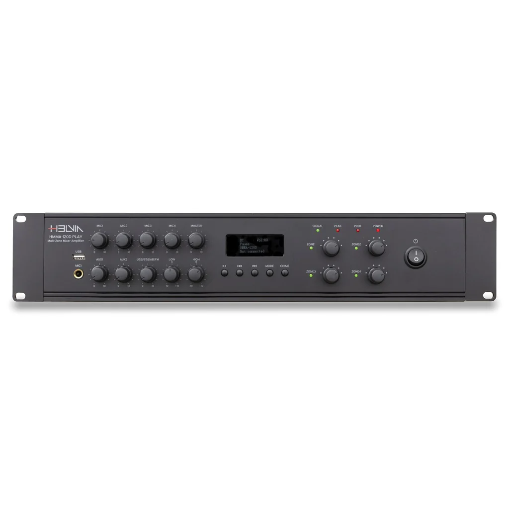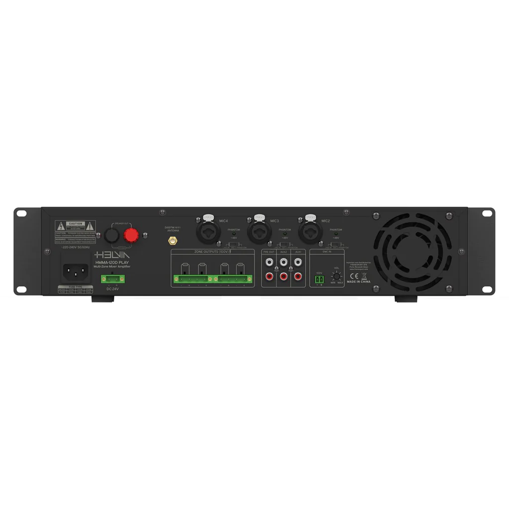 Home Amplificadores Profissionais HMMA-350D PLAY - HELVIA HMMA-350D PLAY - HELVIA 475,00 € Desconto de %. IVA incluído. Comprar Contactar Adicionar à wishlist Rated power: 350W. Frequency response: 100Hz-16Hz. Power outputs: 100V for each zone; Overall @ 4-160. THD: =%1. S/N Ratio: =80dB. N. Channels: 4 Mic Inputs, 2x Aux Line Inputs, 1x FM/DAB+/BT/USB Built-In Player. Eq Controls: Low (± 6dB @ 150Hz) High (± 6dB @ 10kHz). AUX Output: 1000mV. AUX 1-2 Input: 300mV. Mic 1 Input: 15mV ±3mV. MIC/Line 2/3/4 Inputs: 30mV ±3mV (Mic Position); 300mV (Line Position). EMC Input 100V. BT: BT; 5.0 Version with EDR (10m receiving range, without obstacles). DAB+: 170MHz-240MHz. FM Tuner: 88MHz-108MHz. USB Audio Format: MP3, WAV, WMA, SBC (FAT32, max. 128GByte). Main Power: AC220-240V, 50Hz/60Hz. Off-Load Consumption: 8W. Full-Load Consumption: 420W. Auxiliary Power: DC 24V - 10A max. Fuse: F2AL. Unit Size (W x D x H): 482 x 300 x 88 mm (16.8 x 3.5 x 11.8 in). Net Weight: 7.5kg. Marca Helvia Tags amplificador Características Partilhar