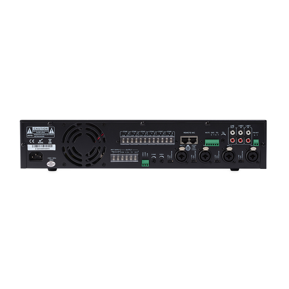 Amplificador de 100V com 6 zonas, 500W de potência. Incorpora leitor USB/ SD -
