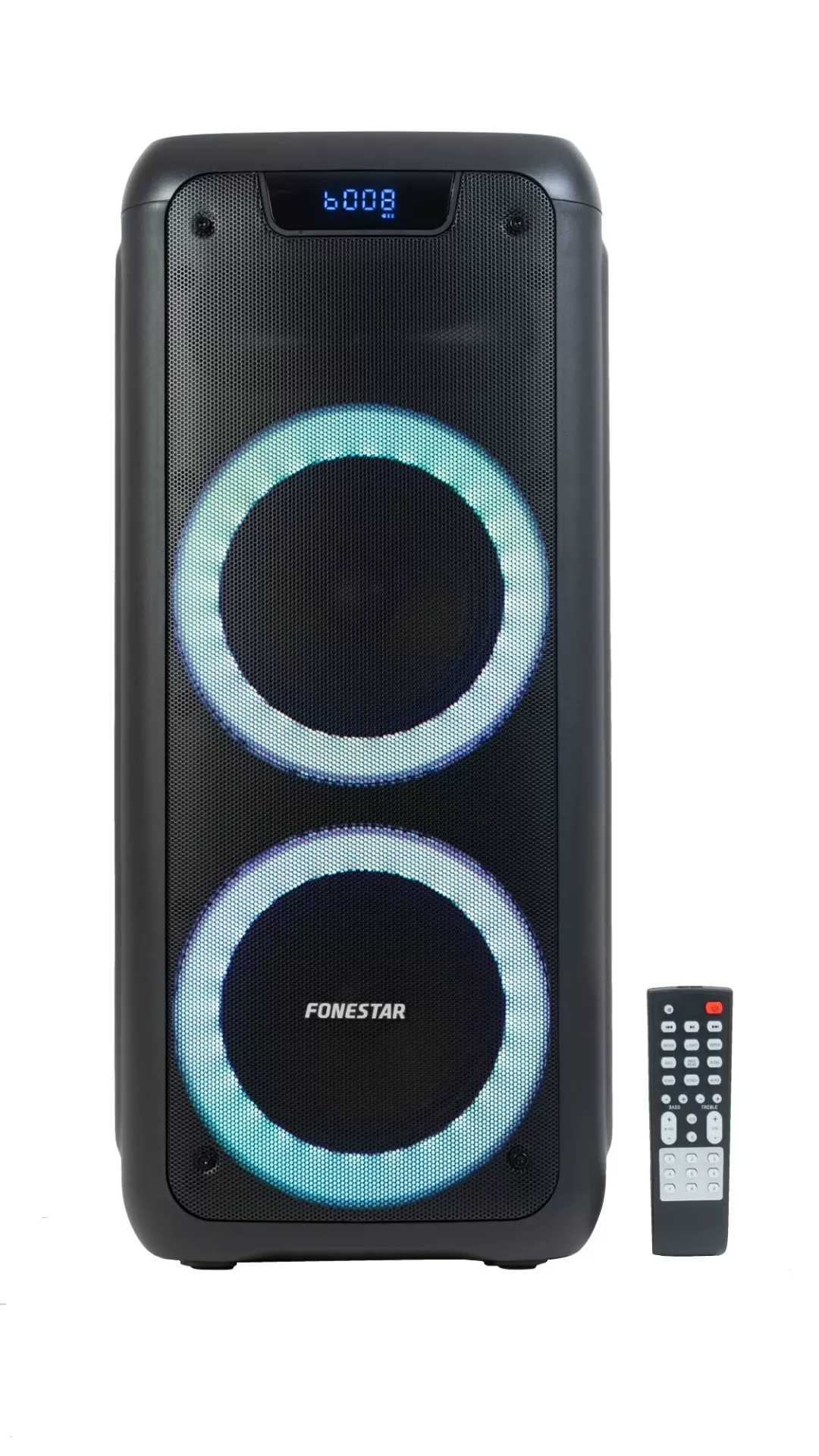 Altavoz portátil inalámbrico Altavoz portátil inalámbrico con 2 woofers de 6 ½' y 1 tweeter de 2' que proporcionan gran potencia y calidad de sonido. Reproductor USB/microSD y sintonizador digital FM, todos los formatos de reproducción en un solo dispositivo. Incorpora 2 entradas de micro con control independiente de eco y volumen, ¡monta tu propio karaoke en casa! Su entrada auxiliar aumenta las posibilidades de reproducción, permitiendo conectar cualquier otro dispositivo de audio. Doble anillo LED con efectos luminosos al ritmo de la música. Su batería recargable de gran autonomía lo hacen muy versátil y adaptable a multitud de usos. Incluye mando a distancia para control remoto. Uso sencillo e intuitivo para que en ningún momento decaiga la fiesta. Para Karaoke, ambientación musical y visual de pequeños eventos, fiestas, espectáculos ambulantes y actividades al aire libre.