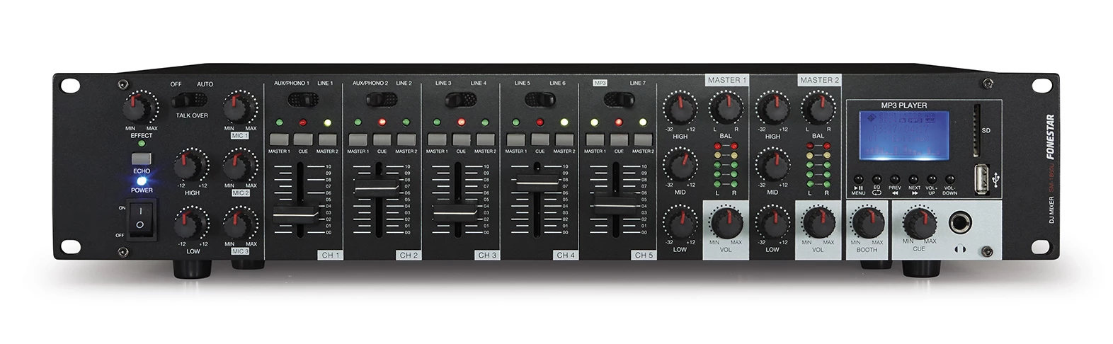 Misturador DJ profissional de 12 entradas, 8 canais (3 microfones e 5 linhas) com reprodutor USB/SD, atribuíveis a 2 saídas master com controlo de volume independente. Função talk over e escuta prévia por auscultadores. Ideal para ginásios, pavilhões desportivos, salas multiusos, entre outros.