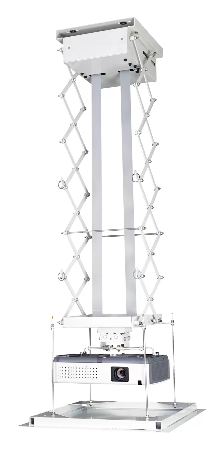 Suporte de projetor elétrico de teto Proporciona uma fixação firme e segura do seu projetor. Otimiza o espaço e confere uma nova estética à sua casa ou negócio. Descida máxima de 100 cm, com ajuste horizontal, inclinação vertical de ±20º e lateral de ±15º. Limites de subida e descida ajustáveis. Incorpora recetor mural e comando à distância com botões de subida, descida e paragem. Dispõe de placa de ocultação ajustável em altura que permite instalar uma placa de teto para esconder completamente o projetor e o suporte. Para uso doméstico (cinema em casa) e profissional (instalações audiovisuais em escolas, escritórios, lojas, etc.).
