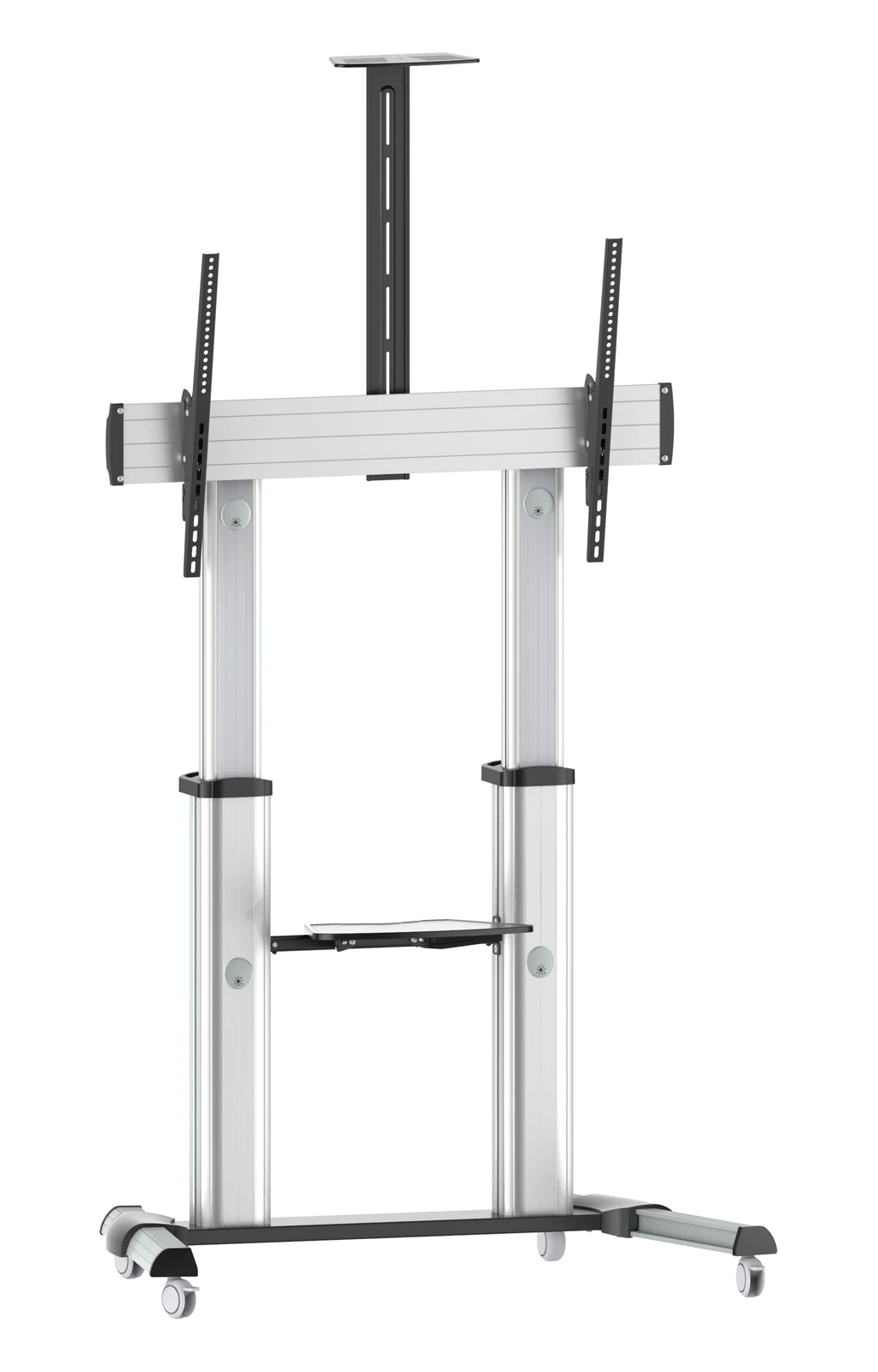 Suporte de chão para TV Para TV de 60'' a 100'' e VESA 200/300/400/400x200/600x400/800x400/800x600/1000x600. É ajustável em altura, largura e inclinação. Inclui prateleiras ajustáveis em altura para equipamento multimédia e câmara. Rodas com travão que permitem fixar o suporte no chão, evitando movimentos indesejados. Fácil de montar e utilizar. Fabricado em alumínio. Inclui instruções e acessórios de montagem. É perfeito para aplicações de ensino, apresentações, conferências, etc.
