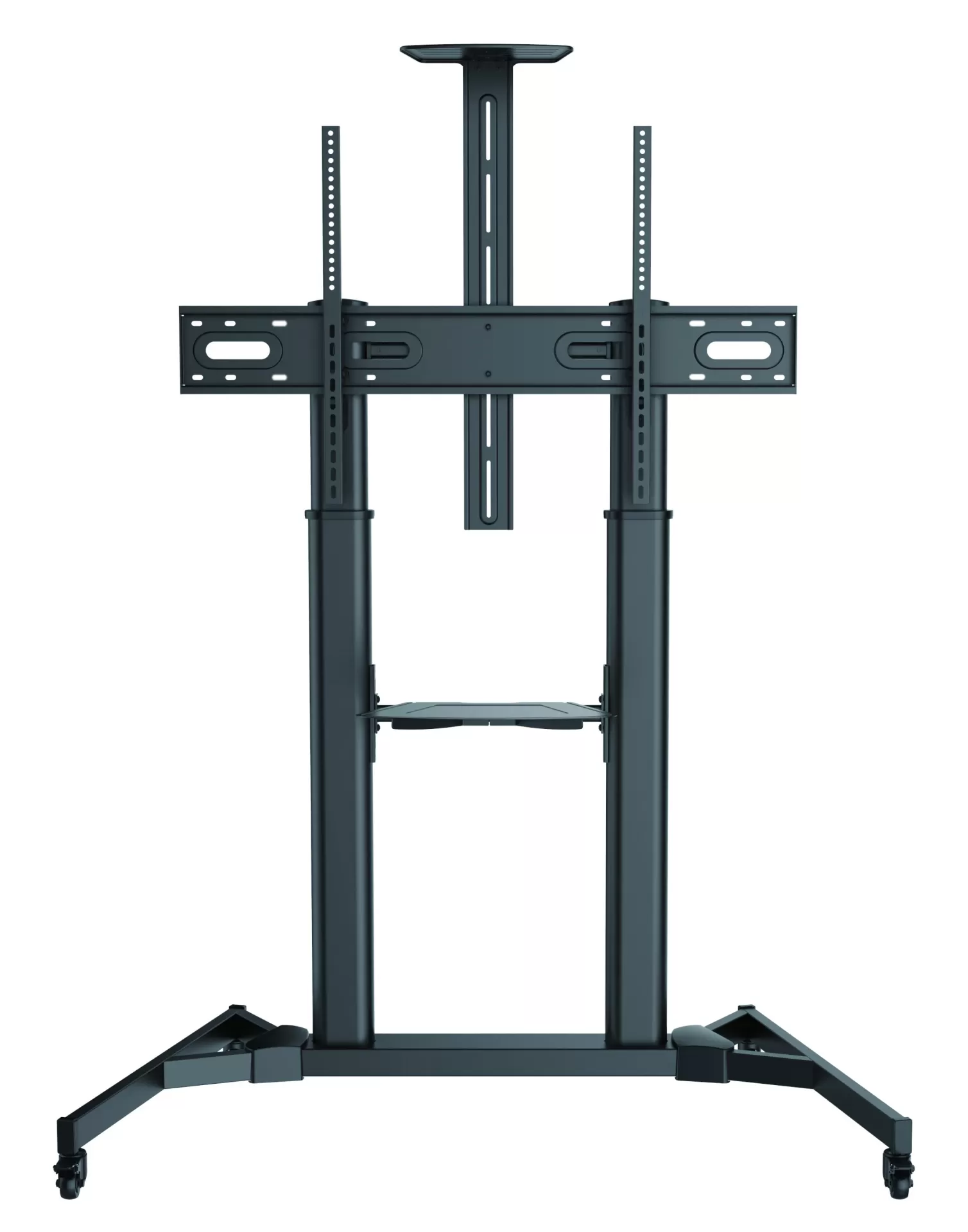 Suporte de chão para TV Para TV de 60'' a 100'' e VESA 200/300/400/400x200/600x400/800x400/800x600/1000x600. É ajustável em altura, largura e inclinação. Inclui prateleiras ajustáveis em altura para equipamento multimédia e câmara. Rodas com travão que permitem fixar o suporte no chão, evitando movimentos indesejados. Fácil de montar e utilizar. Inclui instruções e acessórios de montagem. É perfeito para aplicações de ensino, apresentações, conferências, etc.