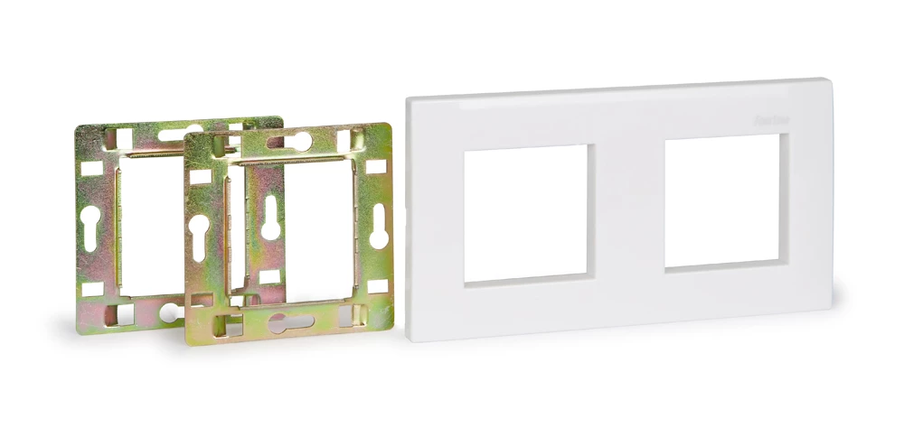 Caixilho e chassis para instalação em caixa standard de embutir universal quadrada. Sistema de painéis de ligação modulares para instalar audiovisuais, salas de aulas, salas de conferências, etc.